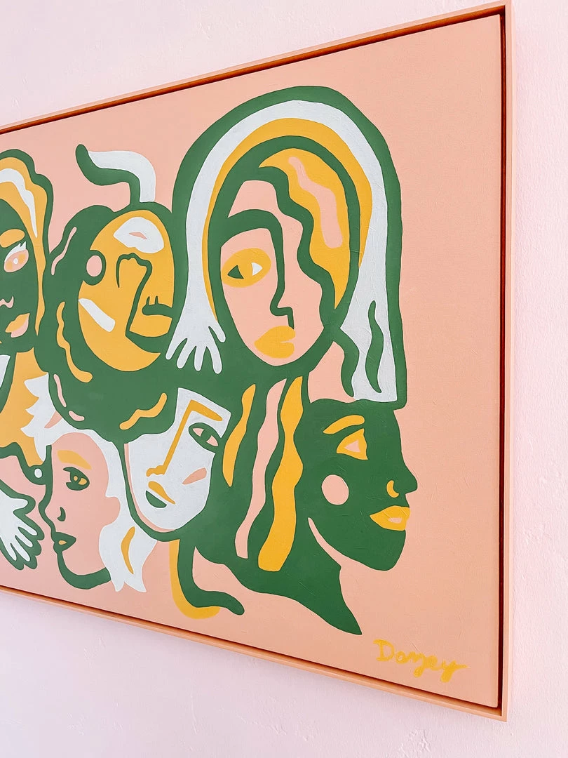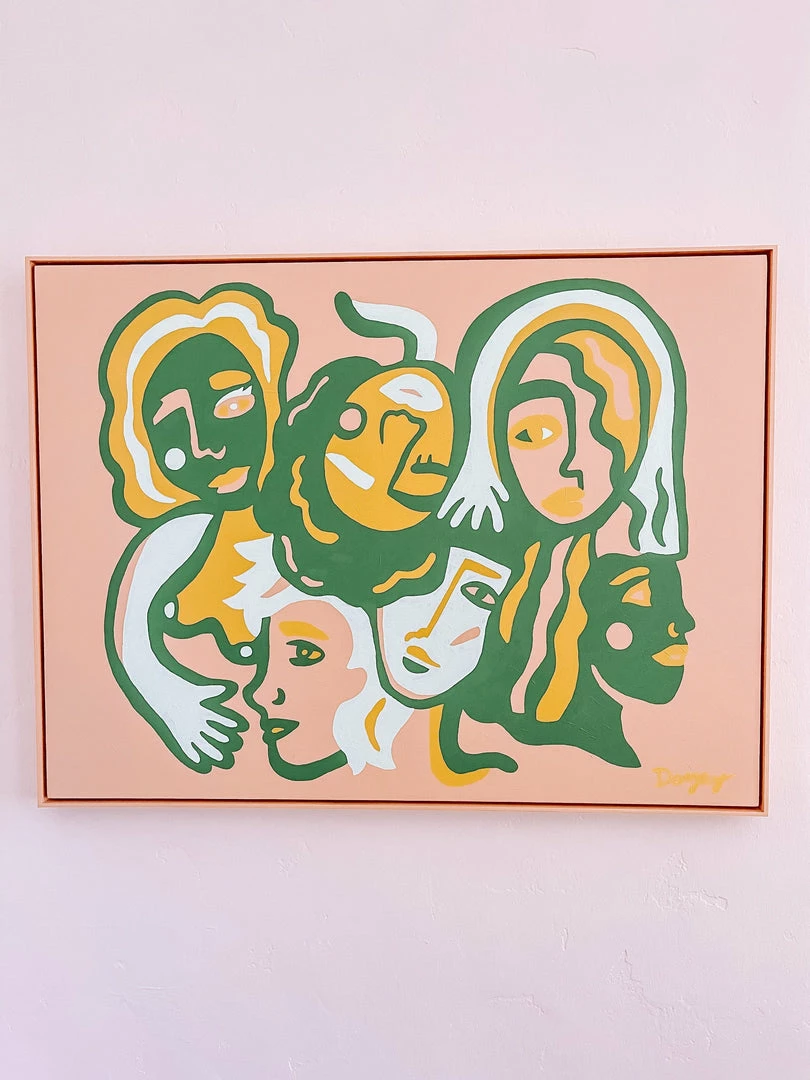 Original painting by Dazey Owner Danielle Roxanne Nagel. Hand-painted and custom framed to match right here in LA. Clean, graphic, and detail-oriented. Full of texture using thick brush strokes. Each piece took weeks to complete and is one of a kind, includes artists signature on the bottom right corner. Inspired by color, vintage design, and empowering women as always.