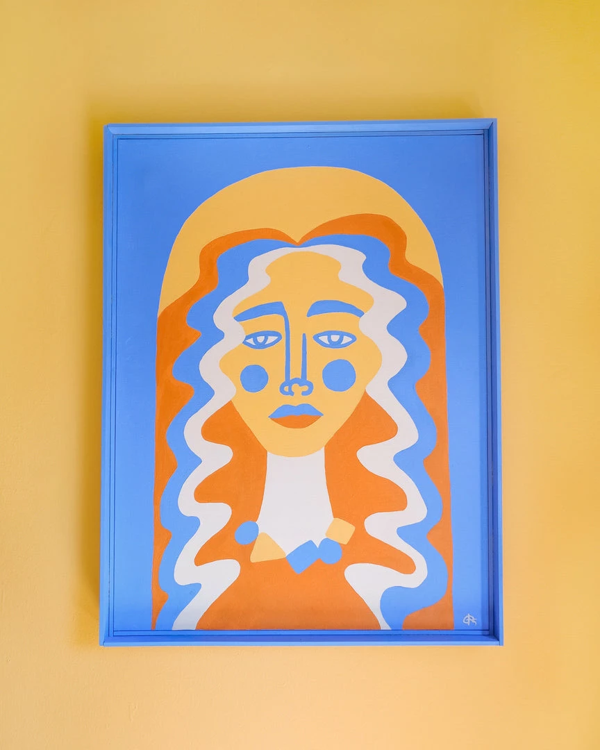 Original painting by Dazey Owner Danielle Roxanne Nagel. Hand-painted and custom framed to match right here in LA. Clean, graphic, and detail-oriented. Full of texture using thick brush strokes. Each piece took weeks to complete and is one of a kind, includes artists signature on the bottom right corner. Inspired by color, vintage design, and empowering women as always.