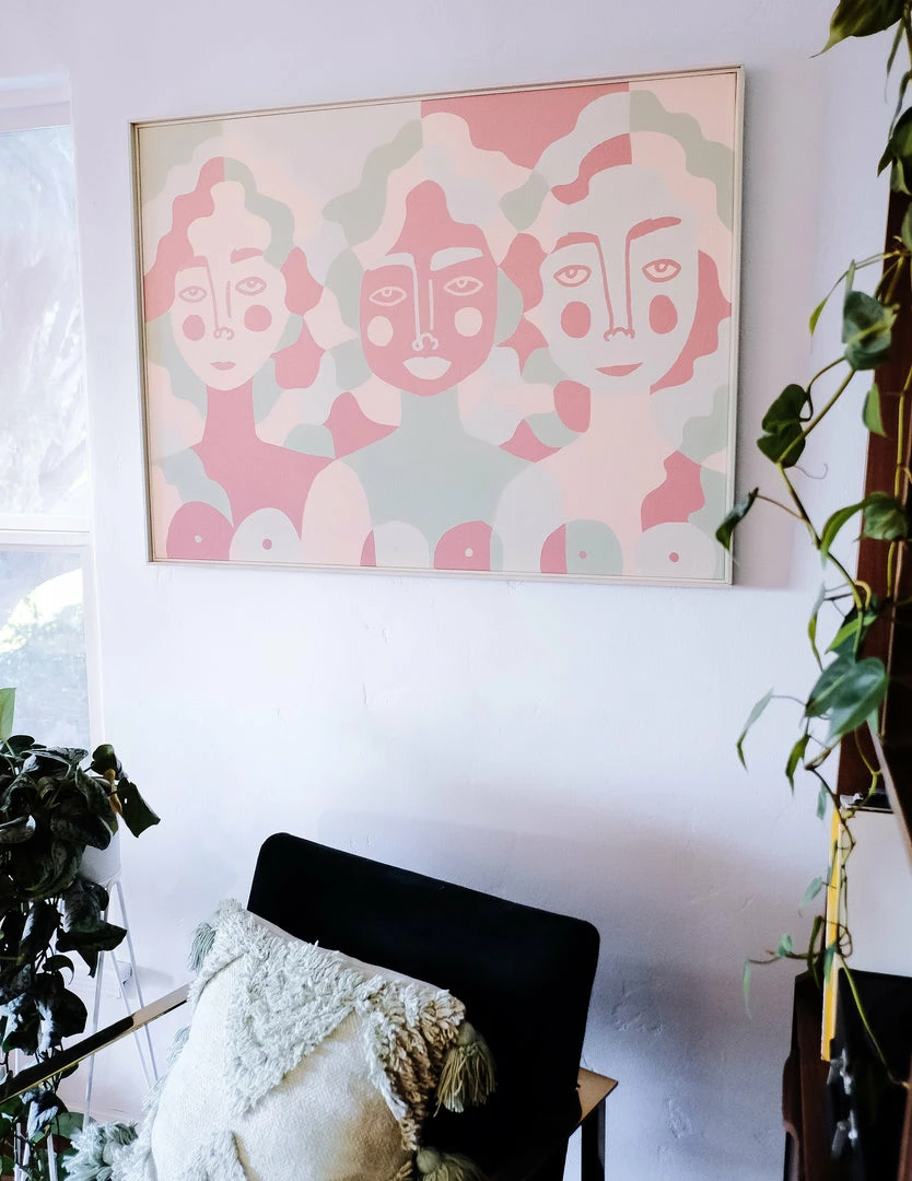 Original painting by Dazey Owner Danielle Roxanne Nagel. Hand painted and custom framed to match right here in LA. Clean, graphic, and detail oriented. Full of texture using thick brush strokes. Each piece took weeks to complete and is one of a kind, includes artists signature on bottom right corner. Inspired by color, vintage design, and empowering women as always.