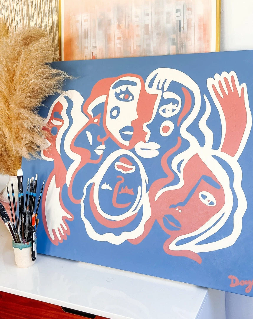 Original painting by Dazey Owner Danielle Roxanne Nagel. Hand-painted and custom framed to match right here in LA. Clean, graphic, and detail-oriented. Full of texture using thick brush strokes. Each piece took weeks to complete and is one of a kind, includes artists signature on the bottom right corner. Inspired by color, vintage design, and empowering women as always.