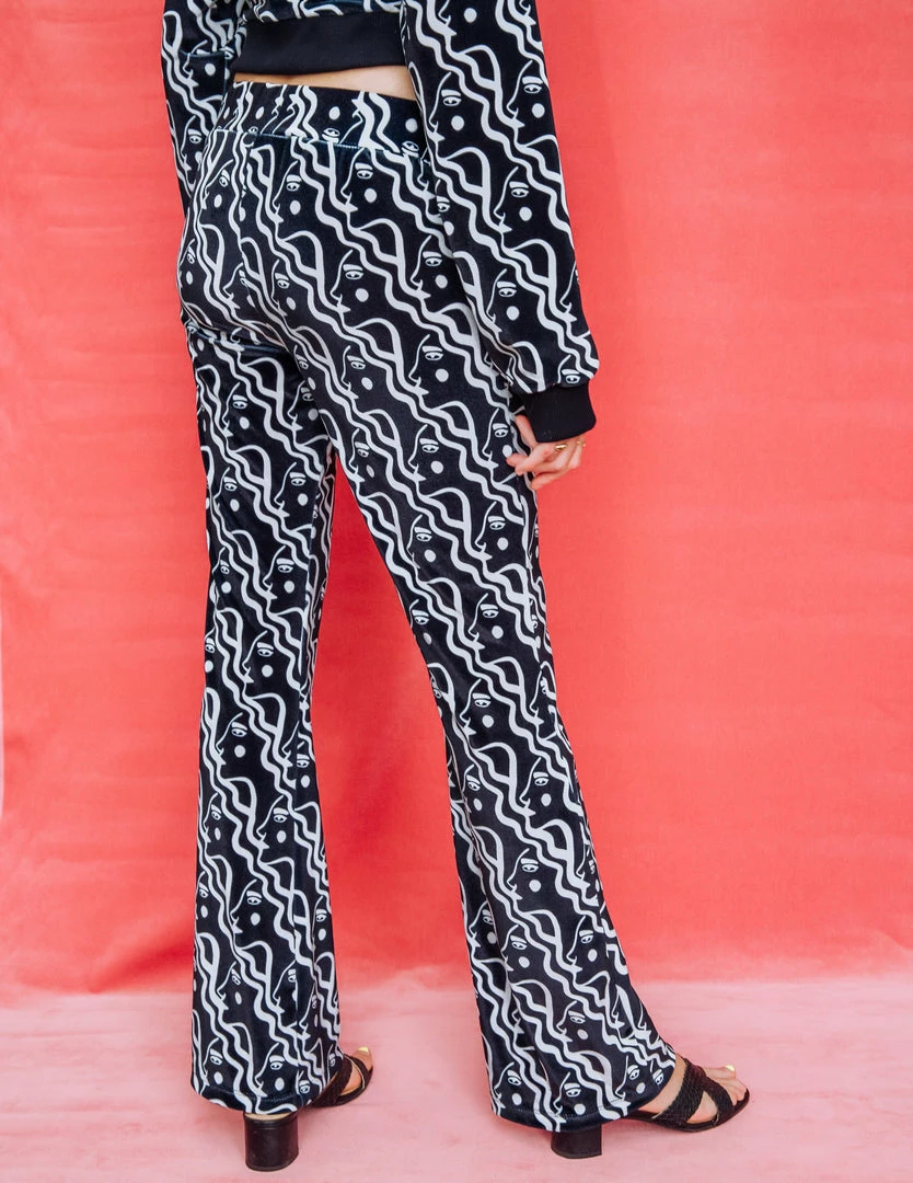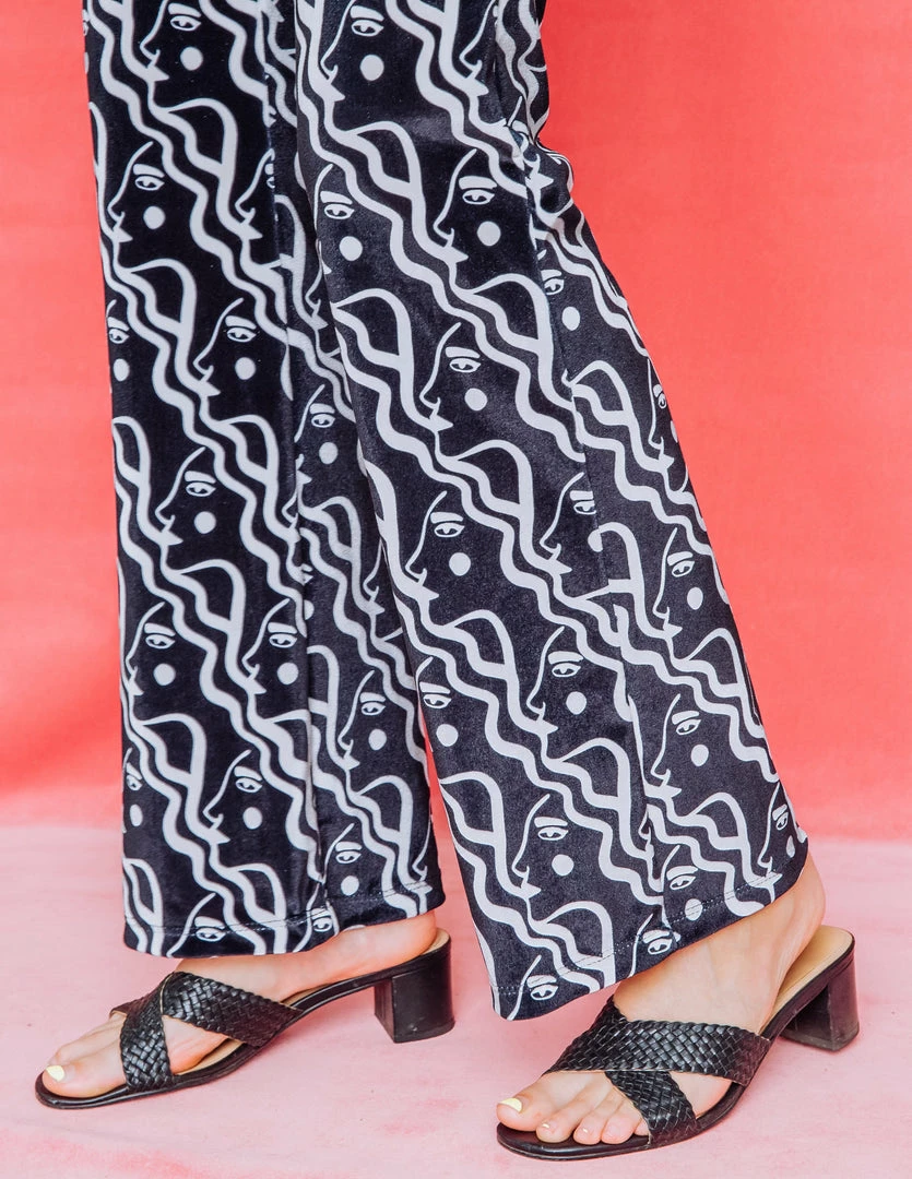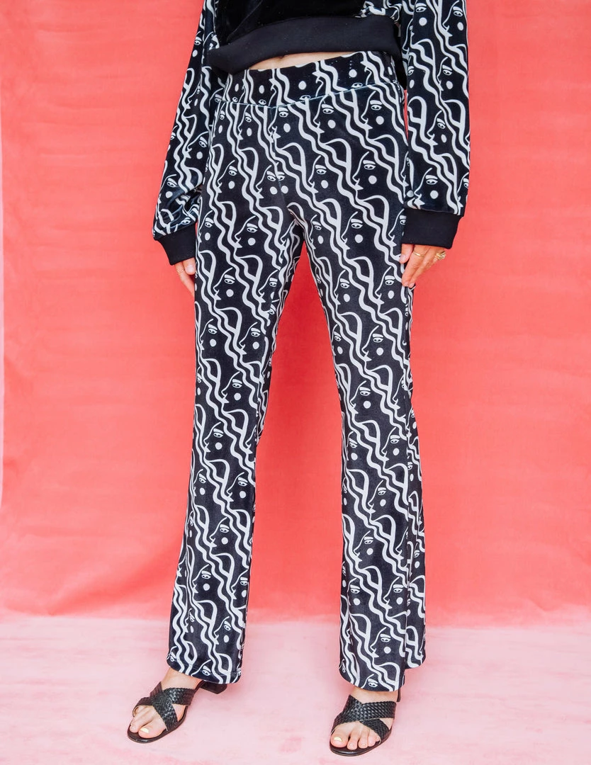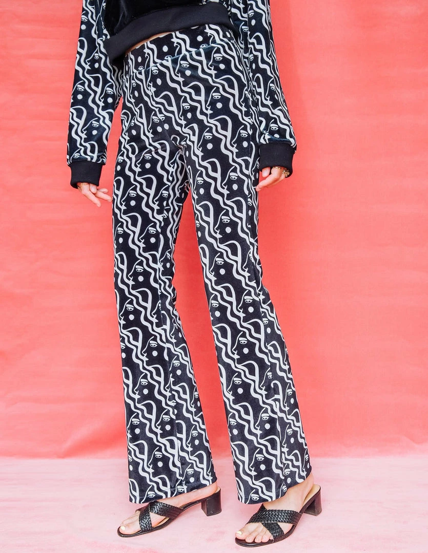 Velvet tracksuit flares – The softest stretchy velvet ever, fully hand designed and made in LA. With a stretchy high waisted waistband, fitted through hips and bum, and flares from thighs down.