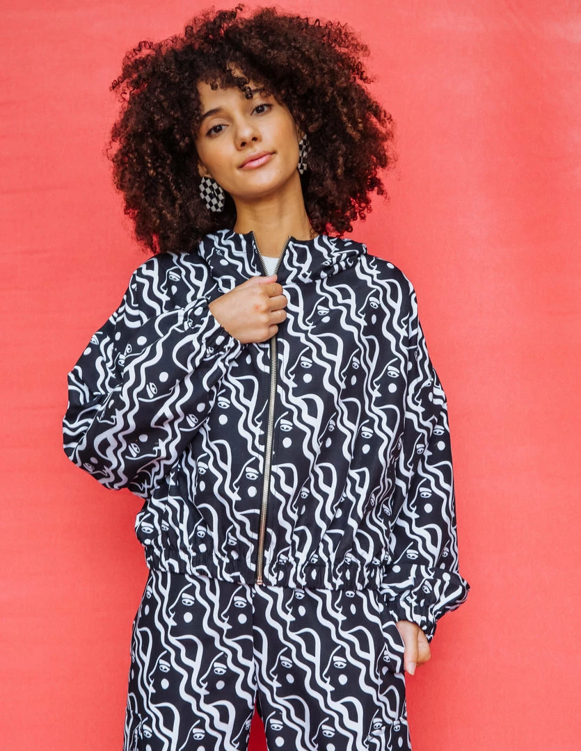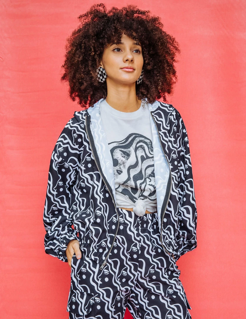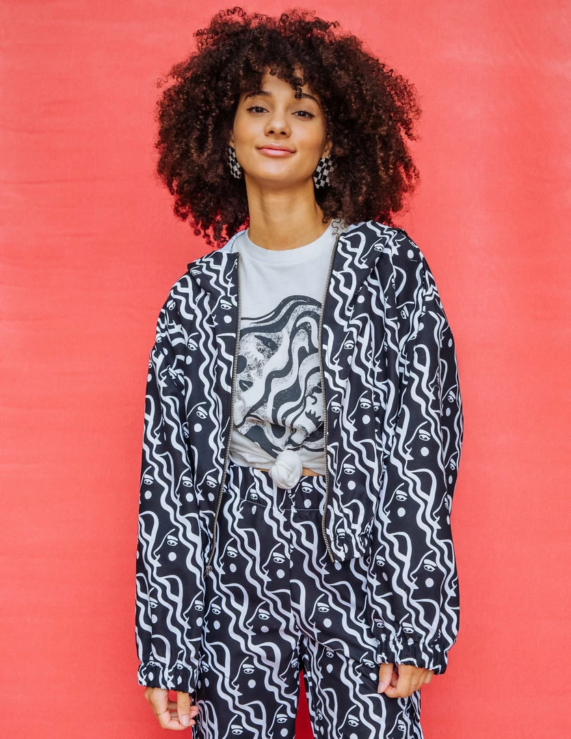 Windy Jacket Details– A light windbreaker style jacket, perfect for light winters or as a layering jacket. Made fully in LA using study yet soft windbreaker fabric. Features top-quality exposed zipper down the front, hood, and side pockets.