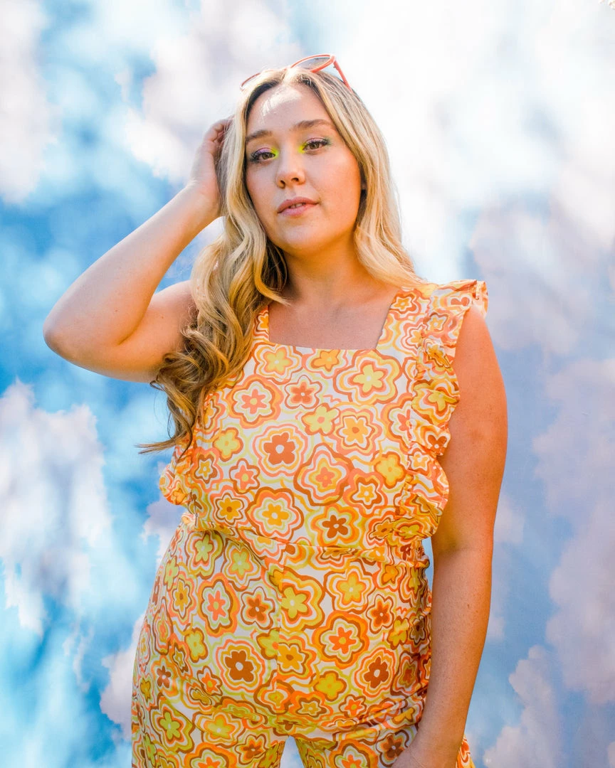 Cute ruffle detail added to our all time best selling overall/jumpsuit. Made from a high quality and sturdy yet lightweight poly. Hand drawn design fully printed and made in downtown Los Angeles in small and sustainable batches. Silhouette designed to be fit-friendly, fabric has a slight stretch. Can be worn with our without layered tee or top underneath, we left enough room to layer but also provide coverage when worn solo. Features deep patch pocket to comfortably fit your phone. Length is semi-cropped and works great for multiple heights!