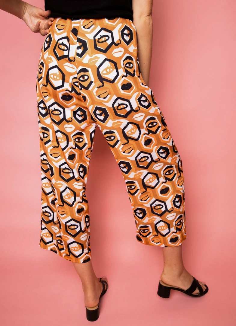 Made from a high quality and sturdy yet lightweight poly. Hand drawn design fully printed and made in downtown Los Angeles in small and sustainable batches. Silhouette designed to be fit-friendly, fabric has slight stretch. Elastic waistband with deep pockets. Length is semi-cropped and works great for multiple heights!