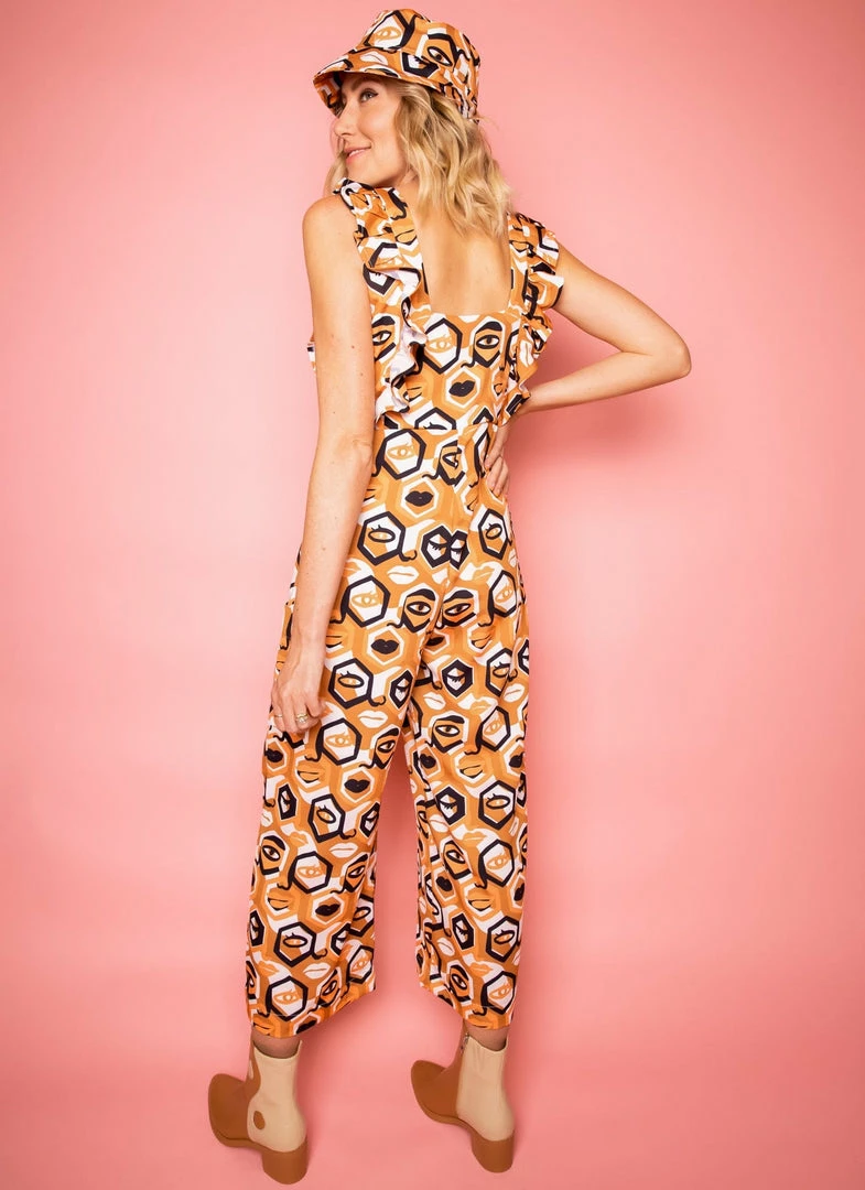 Cute ruffle detail added to our all time best selling overall/jumpsuit. Made from a high quality and sturdy yet lightweight poly. Hand drawn design fully printed and made in downtown Los Angeles in small and sustainable batches. Silhouette designed to be fit-friendly, fabric has a slight stretch. Can be worn with our without layered tee or top underneath, we left enough room to layer but also provide coverage when worn solo. Features deep patch pocket to comfortably fit your phone. Length is semi-cropped and works great for multiple heights!