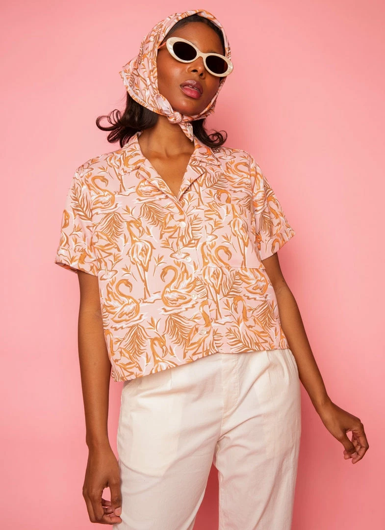 Made from high-quality and sturdy yet lightweight poly. Hand drawn design fully printed and made in downtown Los Angeles in small and sustainable batches. Silhouette designed to be fit-friendly, fabric has a slight stretch. Loose and cropped button-up with rolled sleeve detail. Features patch pocket, deep hem, and self-lined collar. Wear buttoned up with matching shorts/pants as a cozy at-home set, or wear open with one of our tees or active tops underneath! So versatile, can be paired with any matching prints for any occasion.