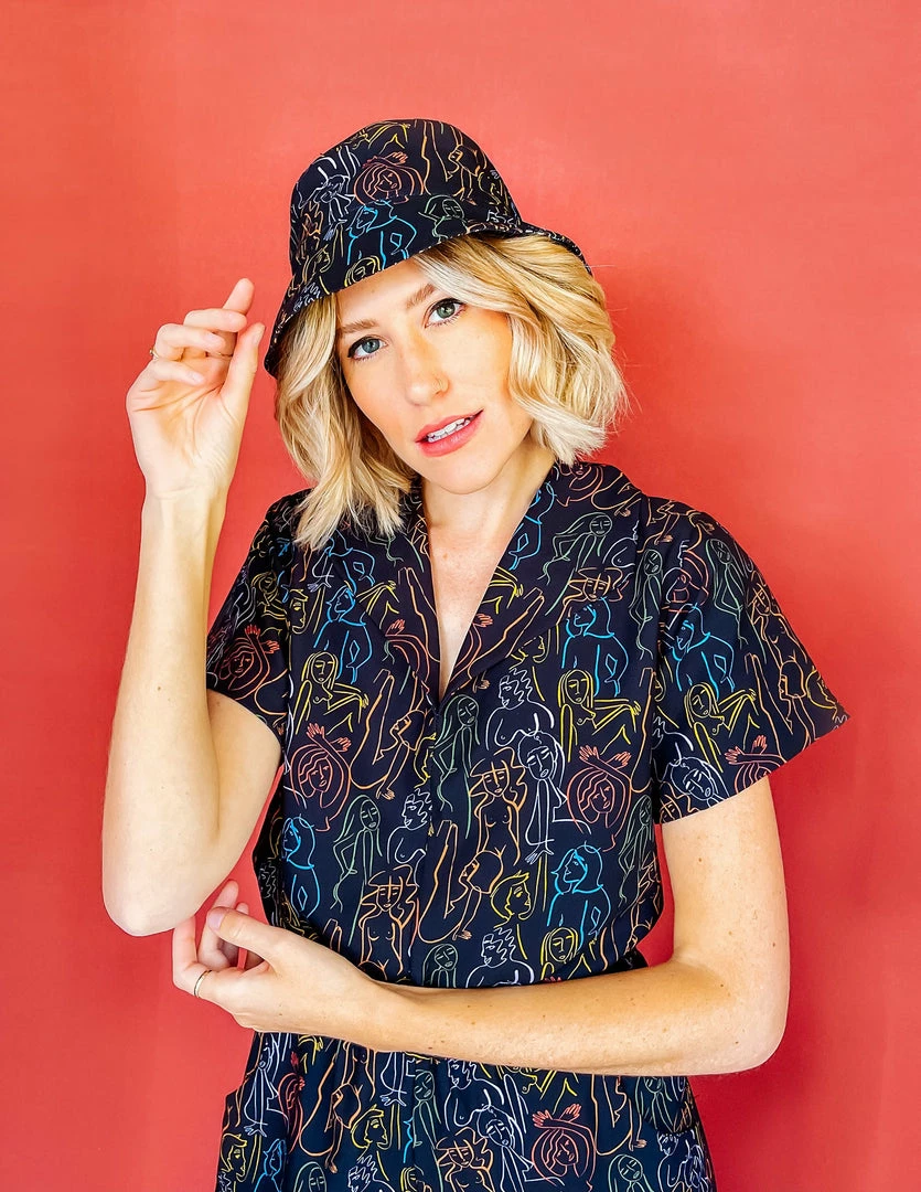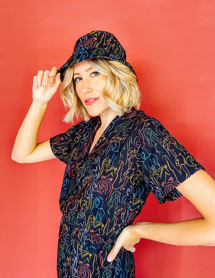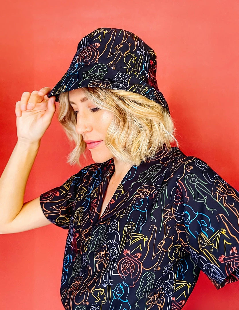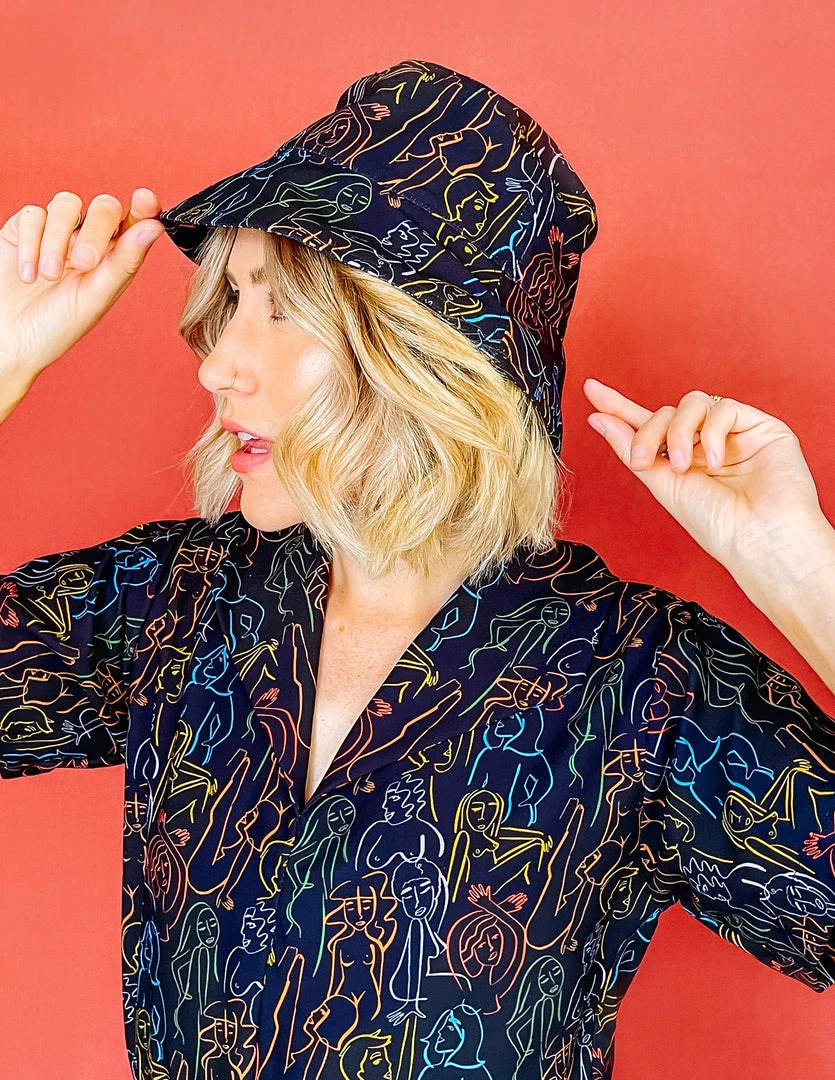 The dreamiest bucket hat around, pairs perfectly with our new dresses and jumpsuits. Silk fabric with thick batting on the inside. Sits perfectly and feels comfortable.Â