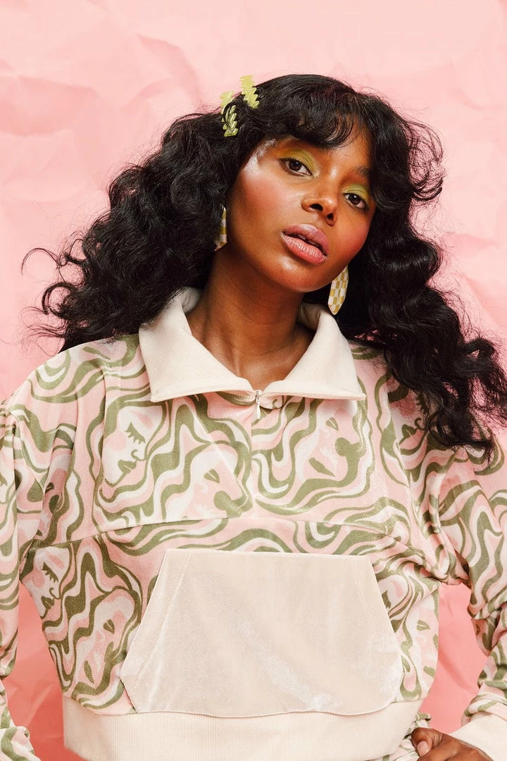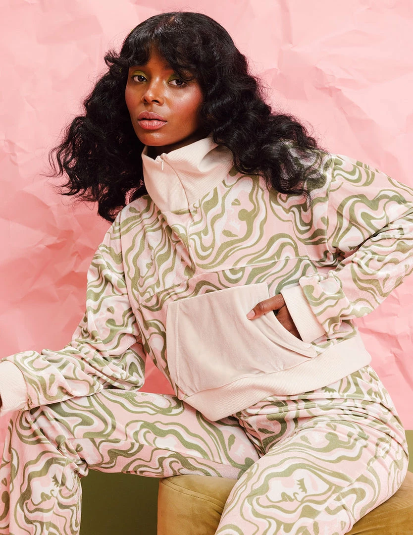 Velvet tracksuit top details – The softest stretchy velvet ever, fully hand designed and made in LA. With top quality cotton ribbed collar and band, cozy velvet pouch pocket, and nice inviable zip pull.