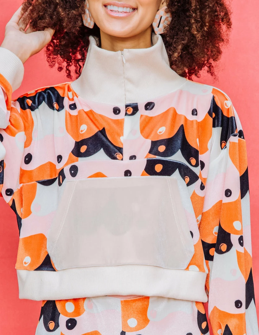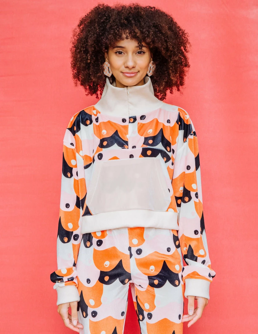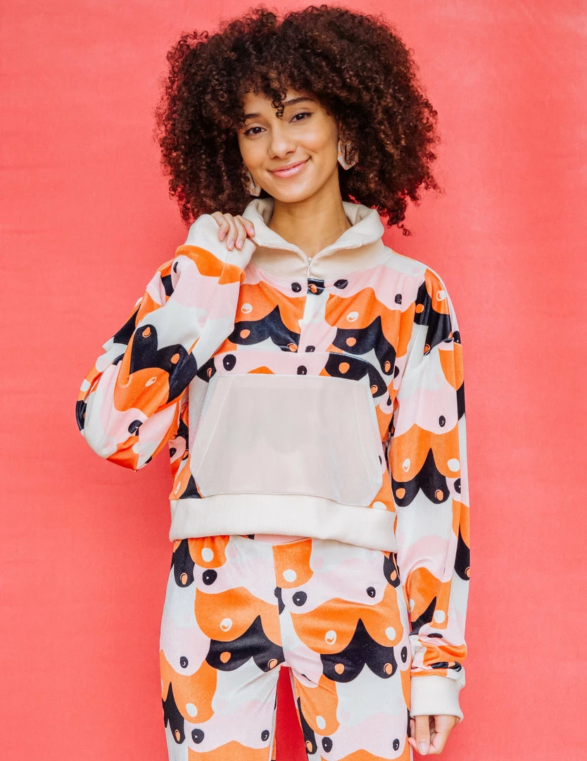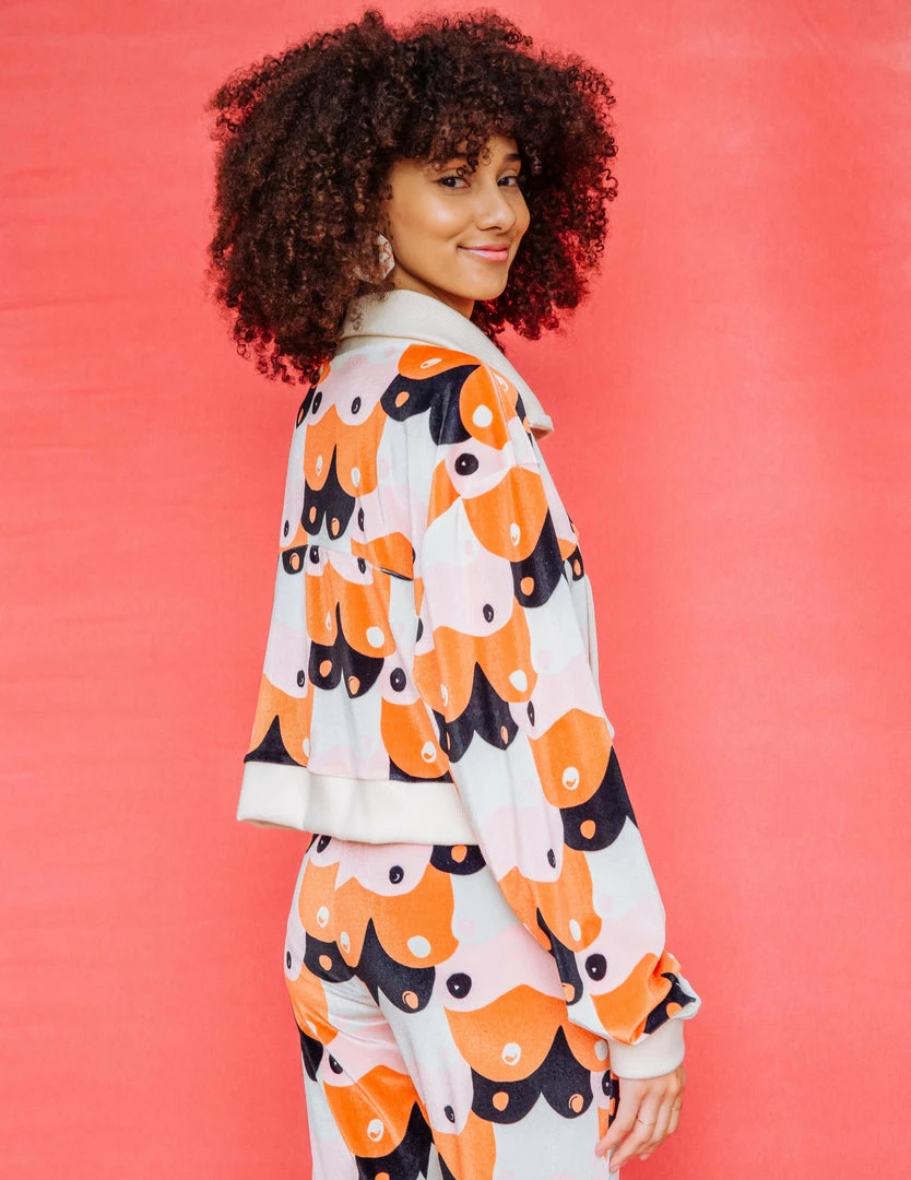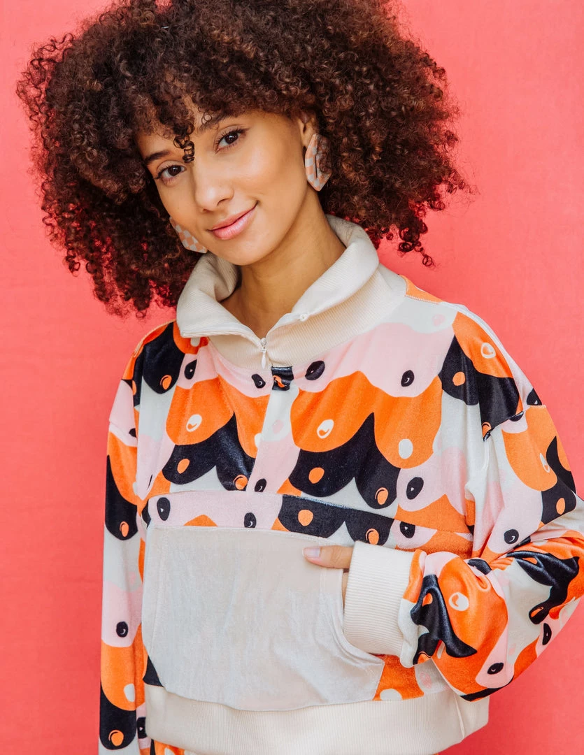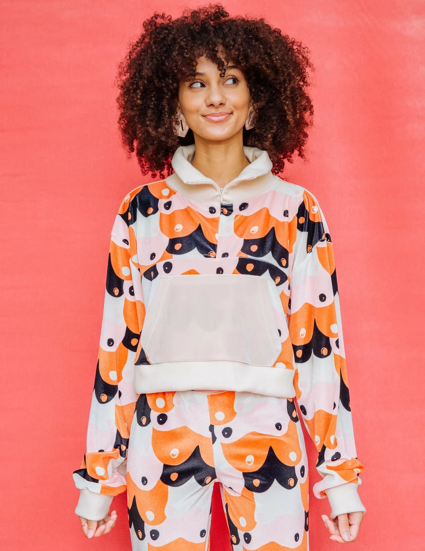 Velvet tracksuit top details – The softest stretchy velvet ever, fully hand designed and made in LA. With top quality cotton ribbed collar and band, cozy velvet pouch pocket, and nice inviable zip pull.