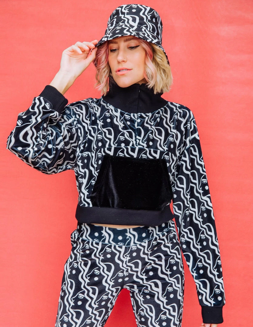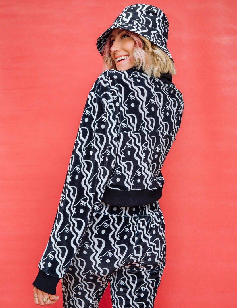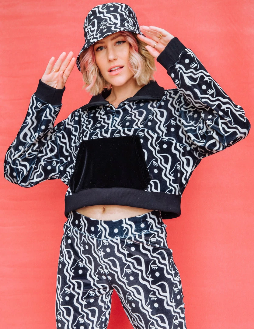 Velvet tracksuit top details – The softest stretchy velvet ever, fully hand designed and made in LA. With top quality cotton ribbed collar and band, cozy velvet pouch pocket, and nice inviable zip pull.