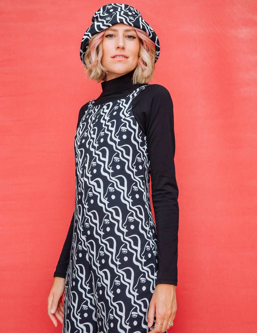 Made from a high quality and sturdy yet lightweight poly. Hand drawn design fully printed and made in downtown Los Angeles in small and sustainable batches. Silhouette designed to be fit-friendly, fabric has a slight stretch. Can be worn with our without layered tee or top underneath, we left enough room to layer but also provide coverage when worn solo. Features deep patch pocket to comfortably fit your phone. Length is semi-cropped and works great for multiple heights!