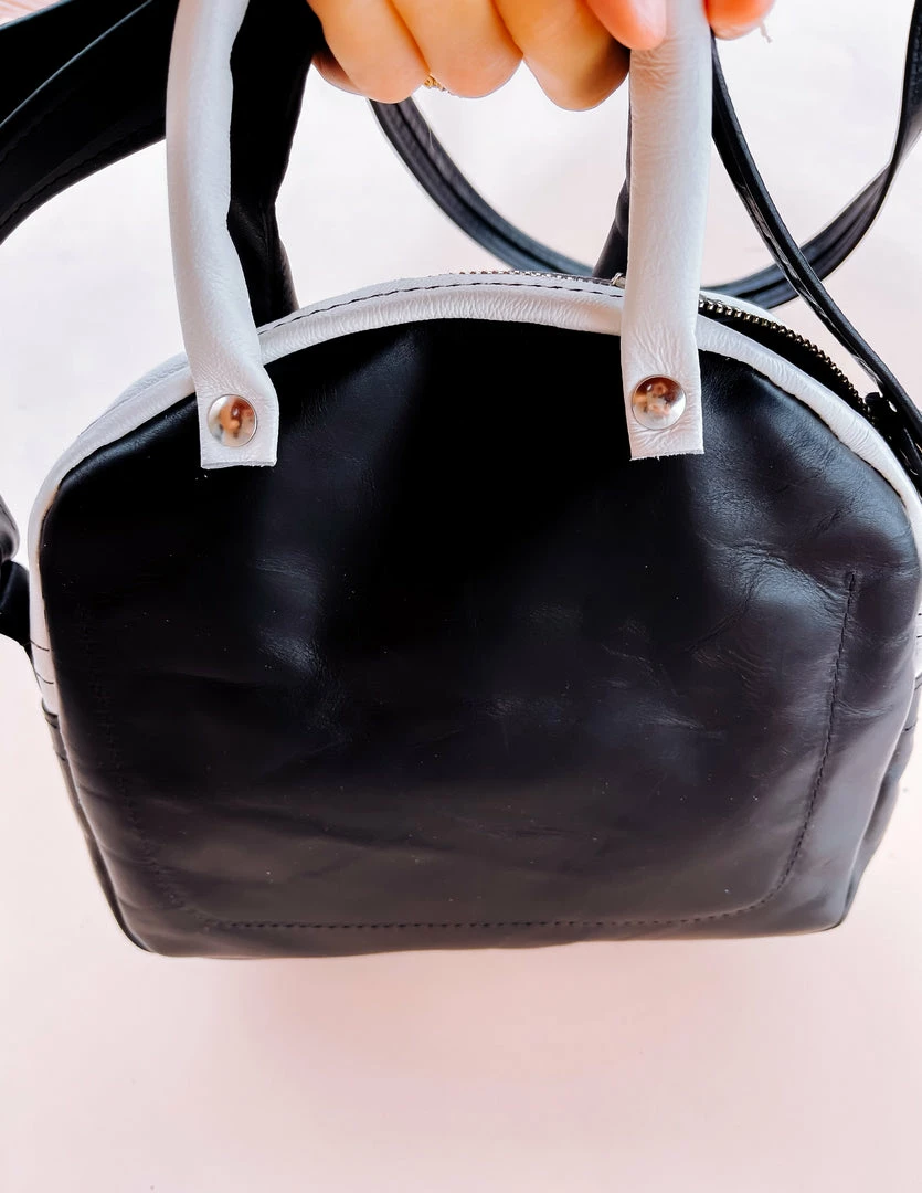 The Bowler Mini features two top handles and a detachable shoulder strap.