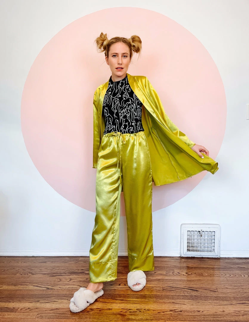Pear green satin. Drawstring bottoms. **Please allow 5-6 weeks to receive your order. Everything is handmade-to-order**