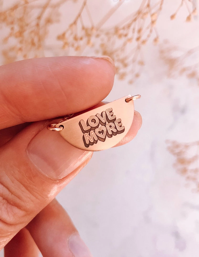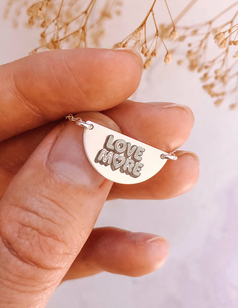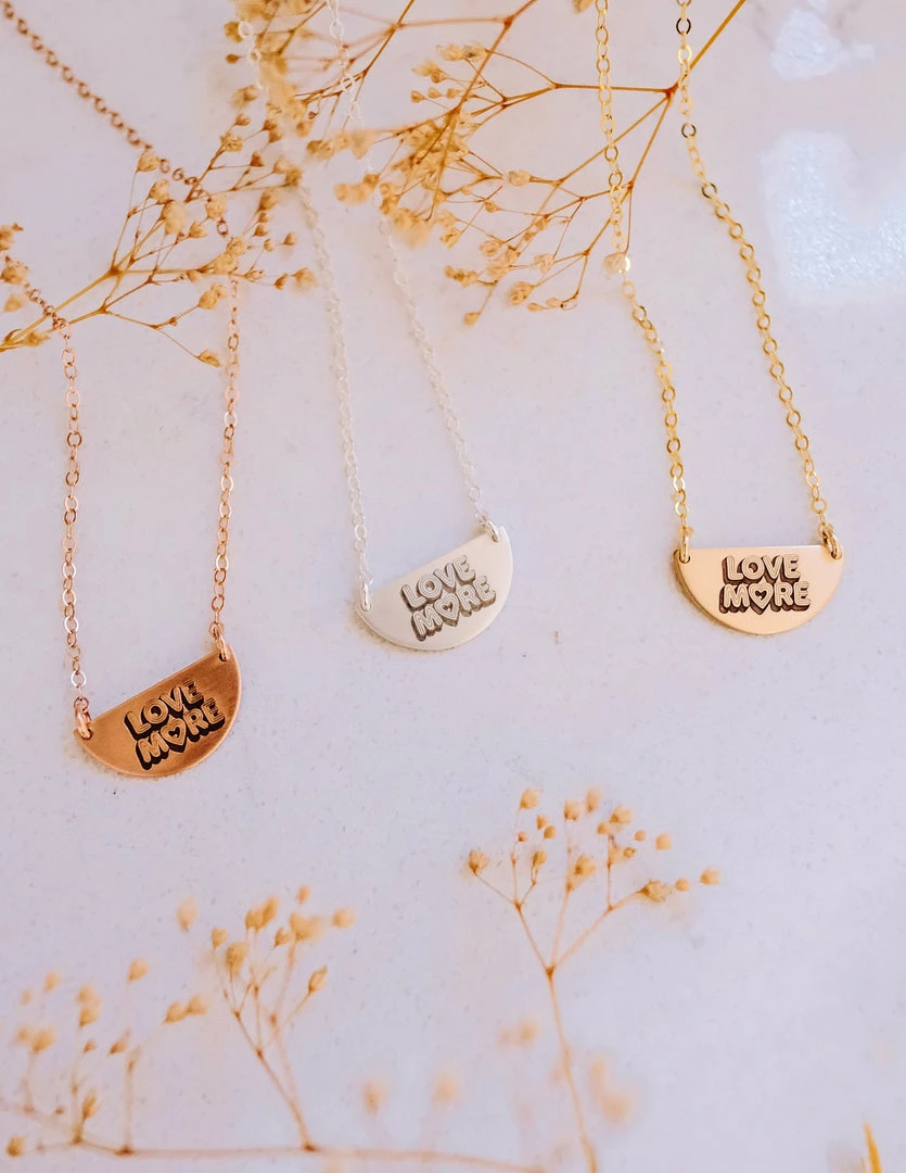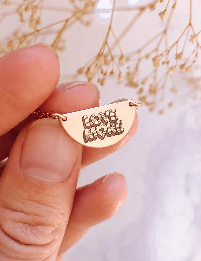 DazeyLA x LEILA signature “LOVE MORE” half moon necklace is available in 14k gold fill, sterling silver or rose gold fill. Made to order, engraved and handmade with care and love in San Diego, CA.Â